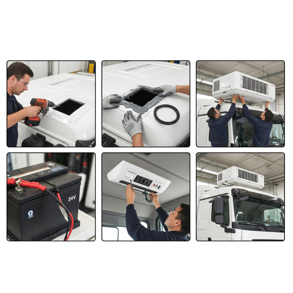 Інверторний міні-кондиціонер верхнього монтажу призначений для встановлення на кабіну вантажного авто, спецтехніки, кемпери та інші транспортні засоби з живленням 12В або 24В.